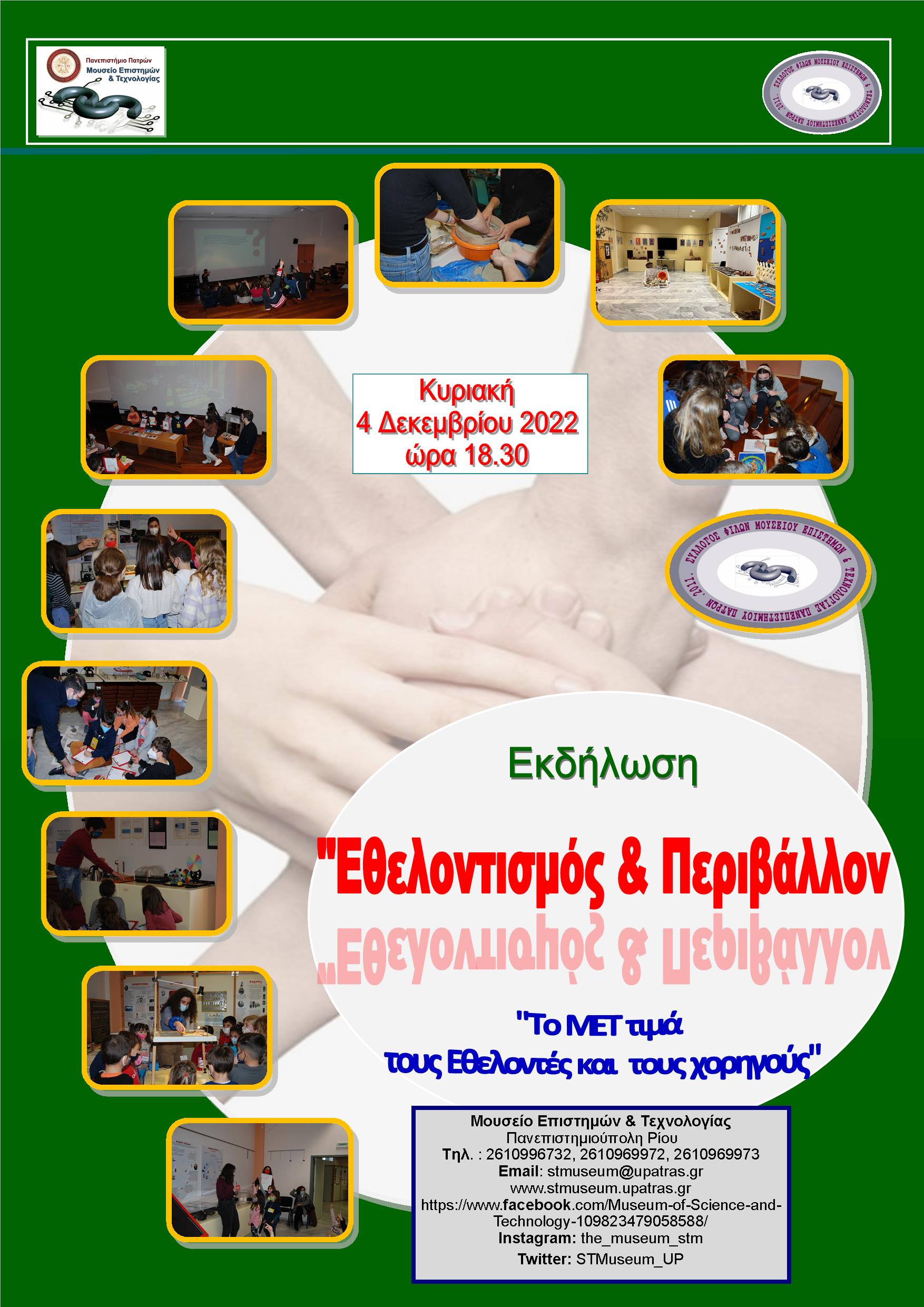 Την Κυριακή 4 Δεκεμβρίου 2022, στις 18.30, το Μουσείο Επιστημών και Τεχνολογίας του Πανεπιστημίου Πατρών (ΜΕΤ) και ο Σύλλογος Φίλων ΜΕΤ, διοργανώνουν στον χώρο του ΜΕΤ την εκδήλωση «Εθελοντισμός και Περιβάλλον, το ΜΕΤ τιμά τους εθελοντές και τους χορηγούς του».
