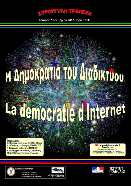 H Στρογγυλή Τράπεζα «Η Δημοκρατία του Διαδικτύου» πραγματοποιήθκε με επιτυχία στις 7 Νοεμβρίου 2012, στις 18.30. Συνδιοργανώθηκε από το Μουσείο Επιστημών και Τεχνολογίας και την Κοσμητεία Ανθρωπιστικών και Κοινωνικών Επιστημών του Πανεπιστημίου Πατρών και το Γαλλικό Ινστιτούτο Ελλάδας-Γαλλικό Ινστιτούτο Πάτρας, με την υποστήριξη του Συμβουλευτικού Σταθμού νέων της Διεύθυνσης Δευτεροβάθμιας Εκπαίδευσης του Ν. Αχαϊας. Απευθύνονταν σε κάθε ενδιαφερόμενο που ήθελε να μάθει περισσότερα για το διαδίκτυο από μια άλλη σκοπιά, αυτή των κοινωνικών και ανθρωπιστικών Επιστημών.