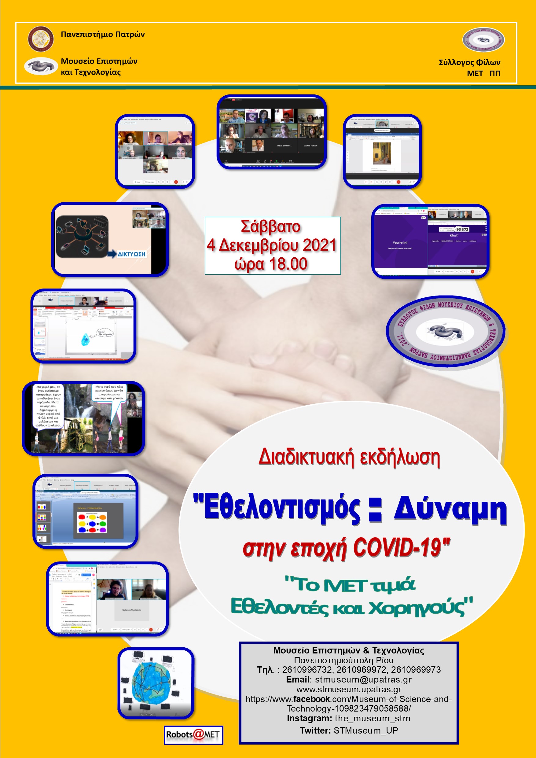 On Saturday, December 4, 2021 at 6:00 p.m. the Science and Technology Museum of the University of Patras (STM), and the Association of Friends of the STM will organize an online event "Volunteering = Strength in the CoVID-19 era" - STM honors its volunteers and sponsors.